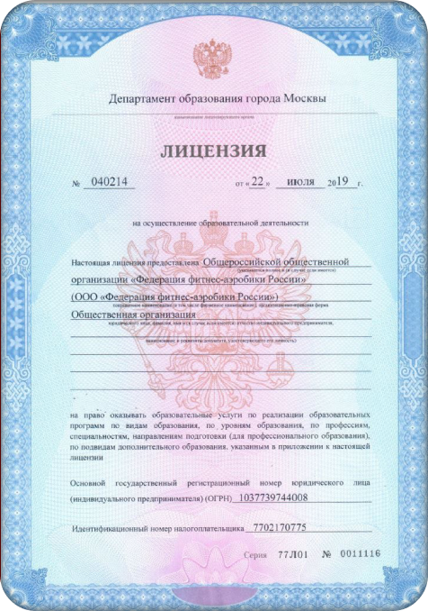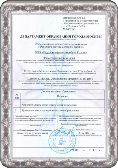 В структурном подразделении дополнительного профессионального образования Общероссийской общественной организации «Федерация фитнес-аэробики России» реализуются программы обучения в части дополнительного профессионального образования, а также дополнительного образования для взрослых и детей, что подтверждается лицензией № 040214 от 22 июля 2019 года, выданной Департаментом образования города Москвы.